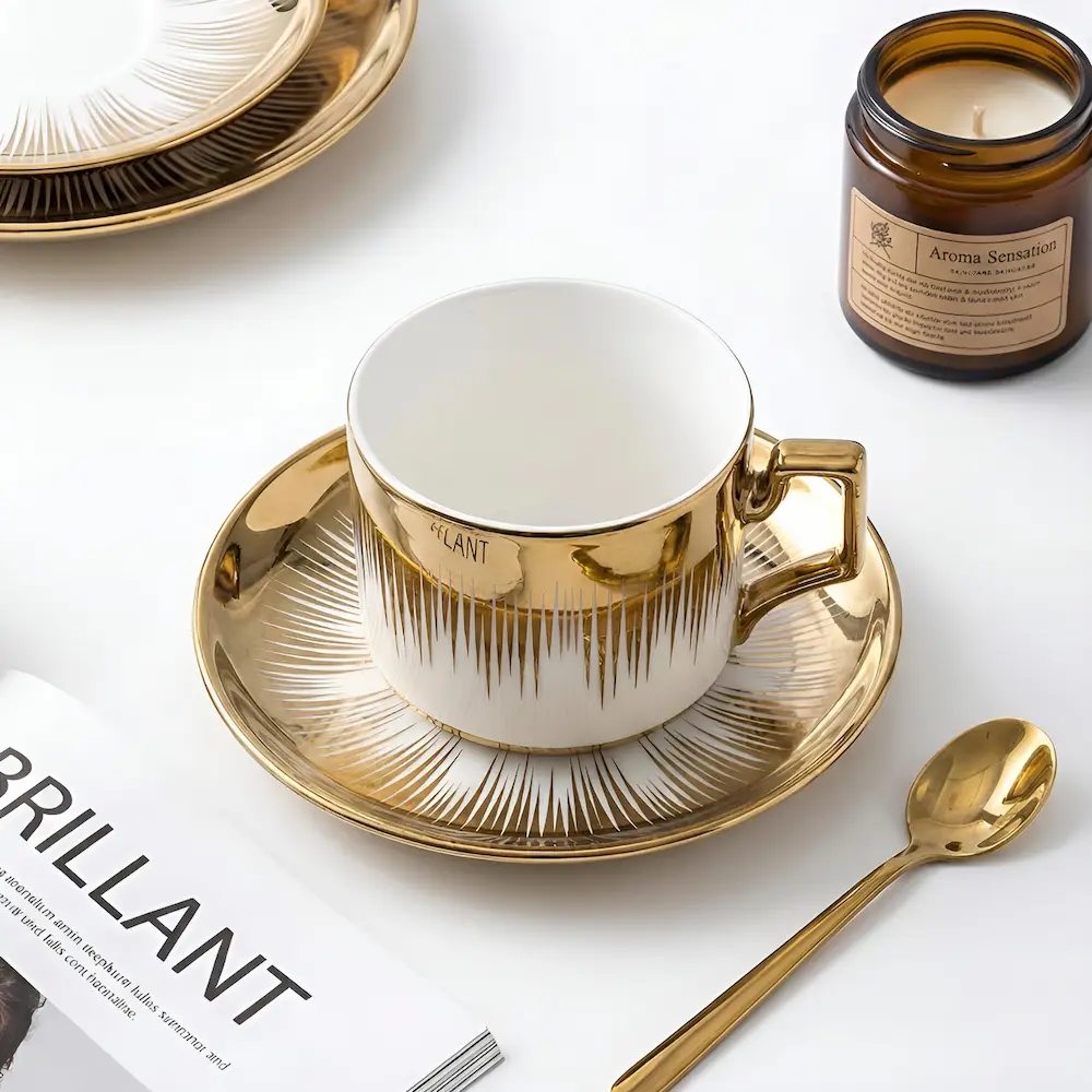 • Protecția Suprafețelor: Farfuriile incluse nu au doar rol estetic, ci protejează fața de masă sau mobilierul de eventualele picături sau de căldura ceștii.
