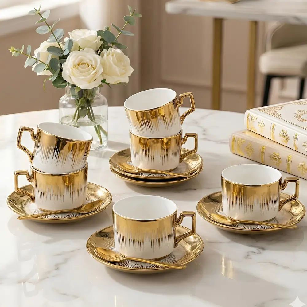 • Set Complet: 12 piese esențiale (6 cești + 6 farfurii) pentru servirea impecabilă a cafelei sau ceaiului.