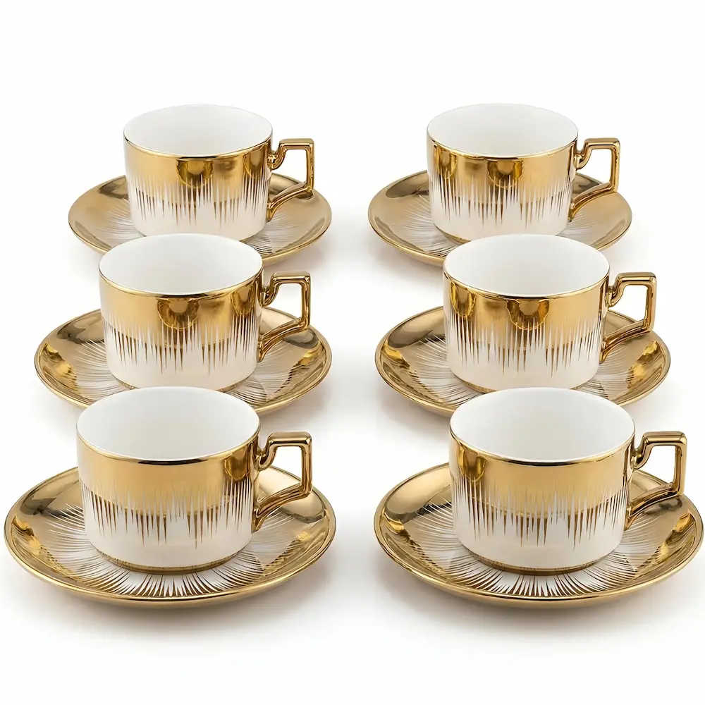 Set 12 piese cafea din ceramică Veselo Royal Gold, 6 cești și 6 farfurii, Alb/Auriu