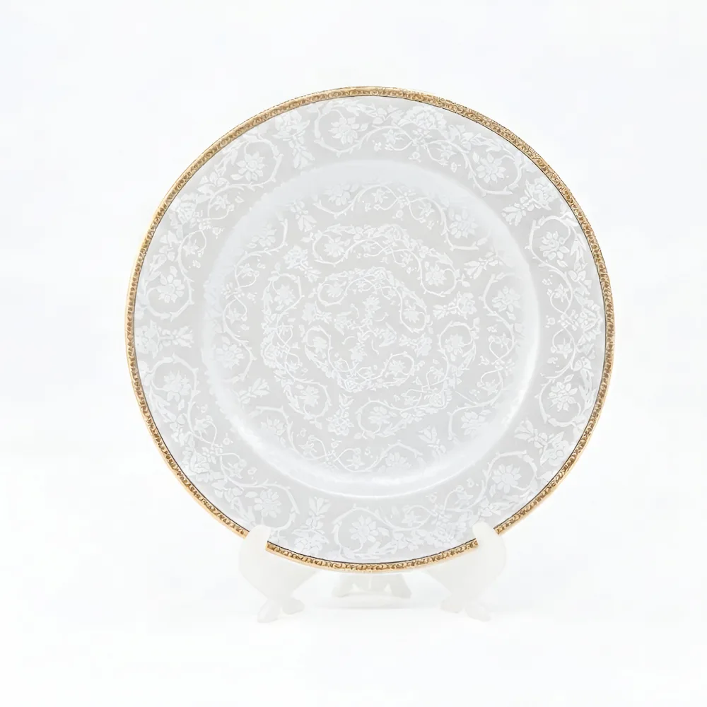 Estetică de Lux: Detaliile subtile din foiță de aur de 24k oferă un contrast superb cu albul imaculat al porțelanului, transformând o simplă felie de prăjitură într-un desert de cinci stele.