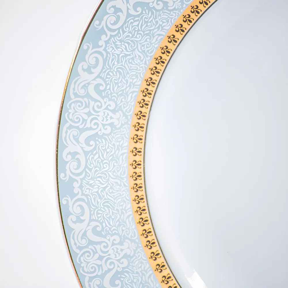 • Finisaj Nobil: Decor clasic cu motive albastre, încununat de o bordură din foiță de aur pur de 24k, aplicată manual.