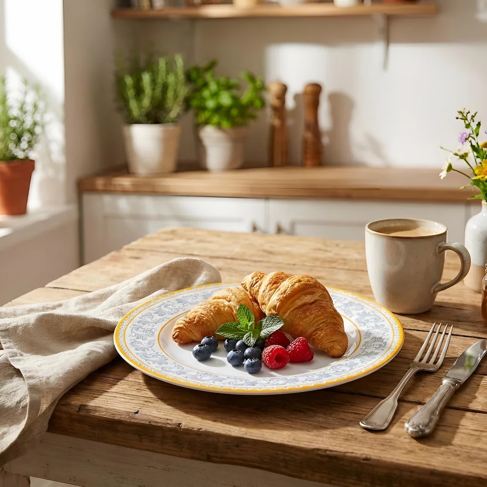 Durabilitate Extremă: Porțelan vitrificat de înaltă densitate, ars la peste 1300°C, rezistent la utilizarea intensă a tacâmurilor (cuțit și furculiță).