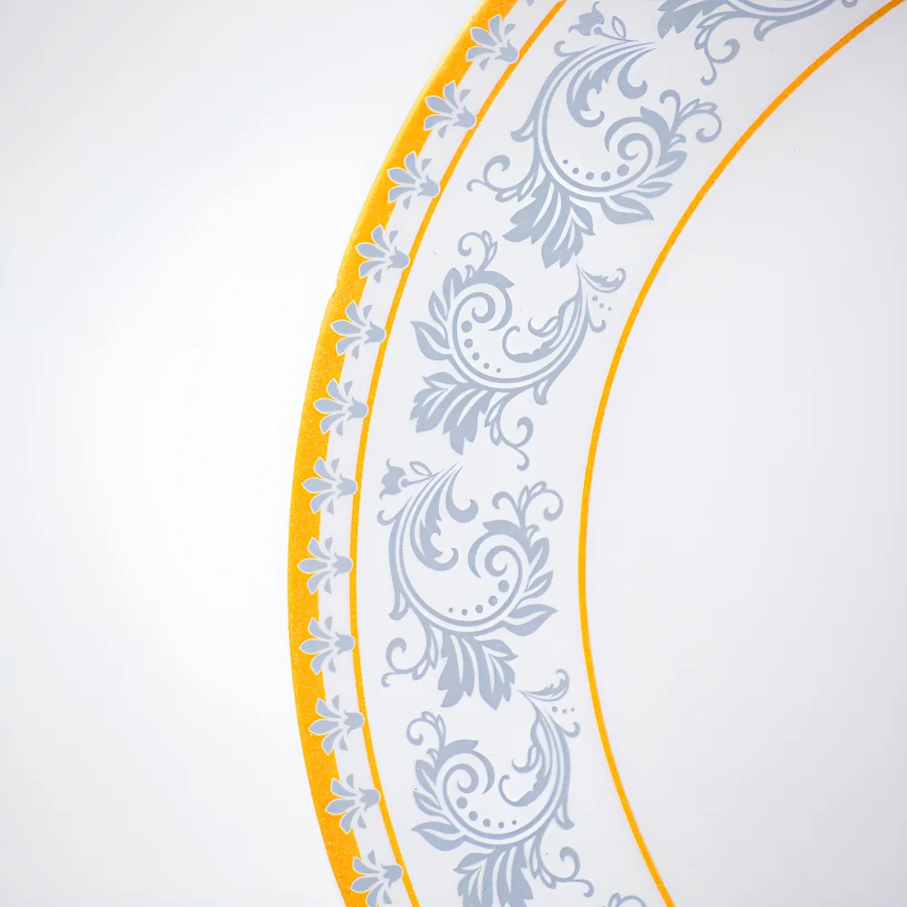 Design Rafinat: Alb imaculat decorat cu motive discrete gri-albăstrui și margini aurii elegante.