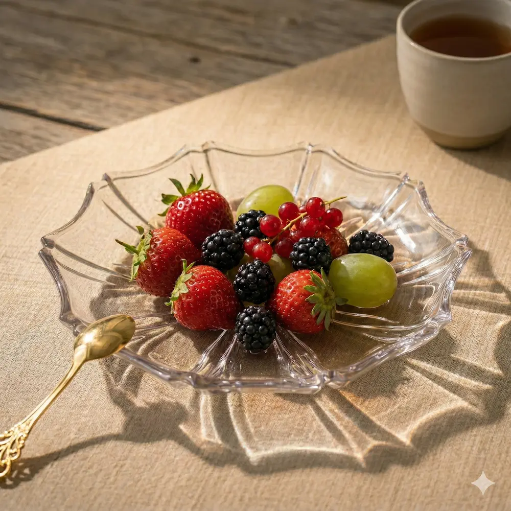 Forma sa plată permite aranjarea fructelor într-un singur strat, oferind un aspect vizual ordonat și facilitând accesul rapid. Este piesa care transformă orice masă obișnuită într-un spațiu de dining modern.