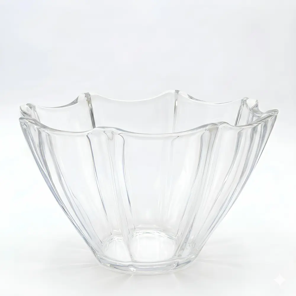 Joc de Lumini: Grosimea peretelui de sticlă creează reflexii spectaculoase, transformând fructiera într-un obiect decorativ în sine, chiar și atunci când este goală.