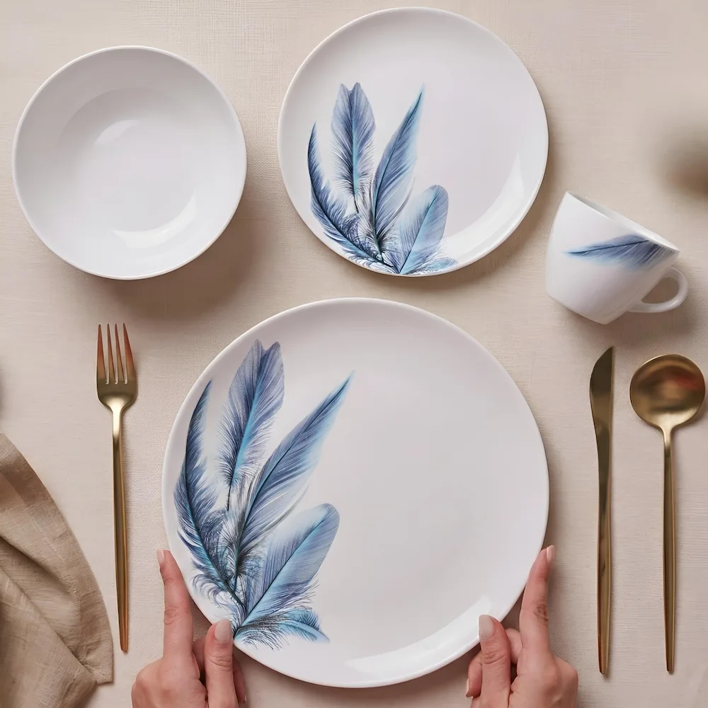 Durabilitate Extremă: Porțelan vitrificat de înaltă densitate, ars la peste 1300°C, rezistent la utilizarea intensă a tacâmurilor (cuțit și furculiță).