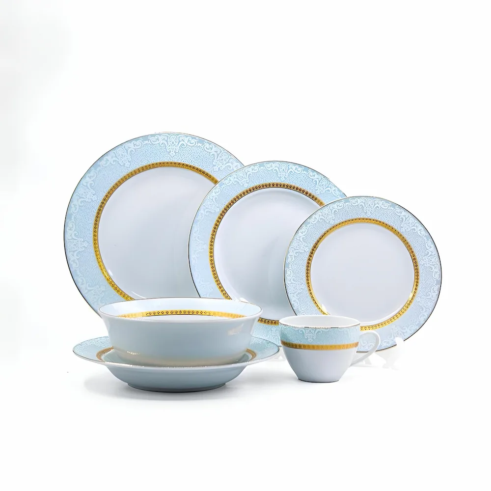 Serviciu de masă din porțelan Veselo Homayoon, 6 persoane (36 piese), Motive Albastre și Foiță de Aur 24k